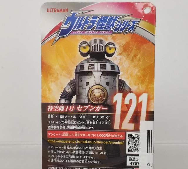 吊卡的背景是燃烧的火焰,但是赛文加这个憨憨的小眼神完全看不到斗志啊hhh。编号是121,定位就是特空机一号,所以这波只是单纯的致敬,不是光之国送过来的。